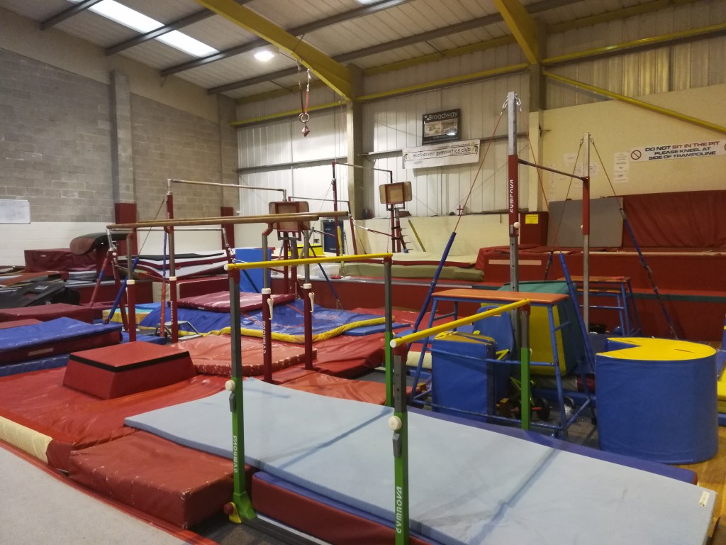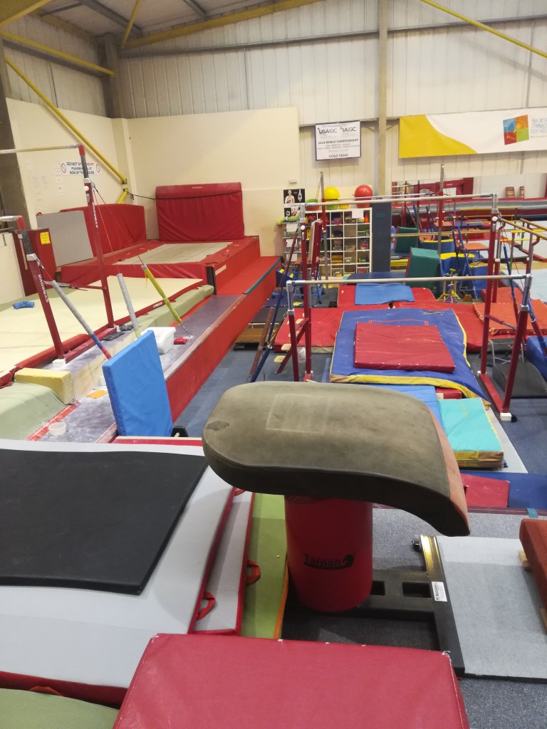 Sprung floor, tumble track, full length mirrors with ballet bar,vault run up, bar area including 2 sets of asymmetric bars, parallel bars, high bar, rings and preschool gymnastics bars, olympic sized trampoline boxed in for safety and a foam pit area for landings from tumble track, vault, bars and trampoline.